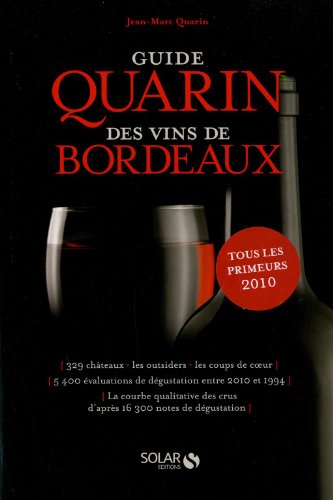 Les amateurs de vins de Bordeaux pourront se mettre en toute confiance entre les mains d’un vrai spécialiste, le critique Jean-Marc Quarin, auteur du Guide Quarin des Vins de Bordeaux. C’est détaillé, précis mais aussi sans concessions ni langue de bois. Une introduction de 60 pages, pertinentes et avec des informations que l’on ne lit pas ailleurs, et 700 pages de dégustations, Château par Château, avec ses coups de cœur, les valeurs montantes, et ceci dans toutes les catégories de prix. Très recommandable et cela vous changera de Parker !