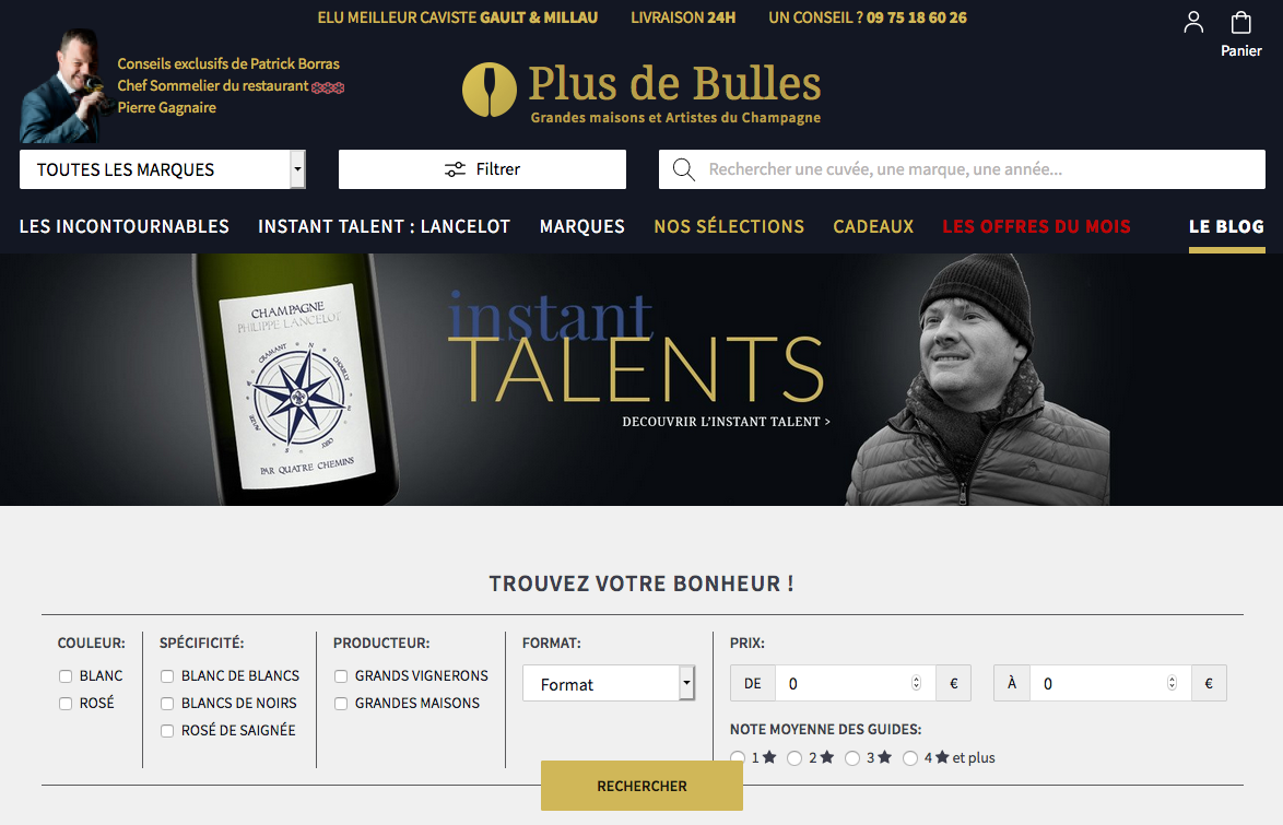 Plus de Bulles figure en outre parmi les sites d’achat de vin et de champagne en ligne les plus vus. En effet, il dispose de plus 1 000 champagnes à des tarifs intéressants. Par ailleurs, en 2011, la revue Gault & Millau l’a élu Meilleur caviste de Champagne sur internet. Les critères de sélection se sont basés sur la pertinence de l’offre, l’expérience utilisateur du site, le délai de livraison et évidemment la qualité du champagne premier prix.